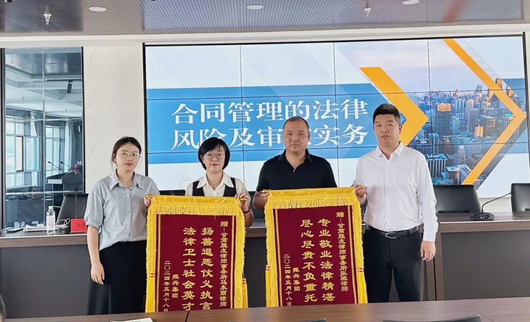 最后,為感謝長久以來為振興集團各項業(yè)務(wù)發(fā)展保駕護航的金牌律所-甘肅勝友律師事務(wù)所及律師團隊的大力支持,振興集團向本次授課的張弛律師、馬永麗律師授予了錦旗。
